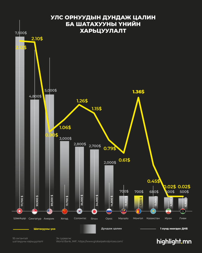 | Улс | Үнэ (₮/литр) | Нэг хүнд ногдох орлого (USD) | Дундаж цалин (USD) |