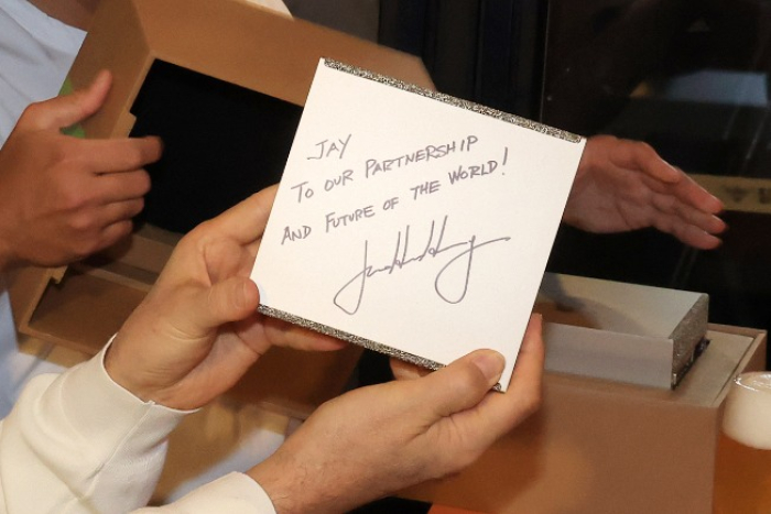Хуань үдэшлэгийн үеэр хамтрагчдаа Японы Suntory Hakushu 25 жил дарсан виски, мөн NVIDIA-ийн DGX хиймэл оюуны систем бэлэглэжээ. Вискийн шошгон дээр “Бидний түншлэл ба дэлхийн ирээдүйд зориулав” гэж бичсэн байв.