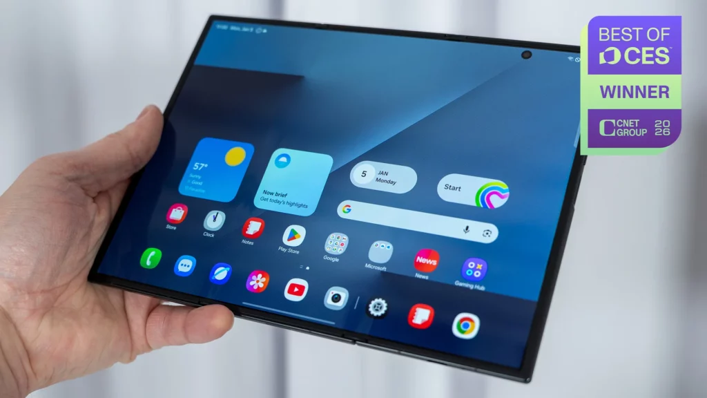 CES-ээс нэг сарын өмнө танилцуулагдсан Samsung-ийн анхны гурван нугалаастай (tri-fold) утас нь хаалттай үедээ энгийн Android ухаалаг утас шиг харагддаг ч, хоёр талаараа дэлгэгдэн 10 инчийн таблет болж хувирна.